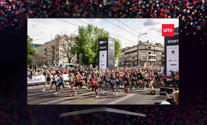Ekran telewizora z grupą biegaczy na starcie półmaratonu.